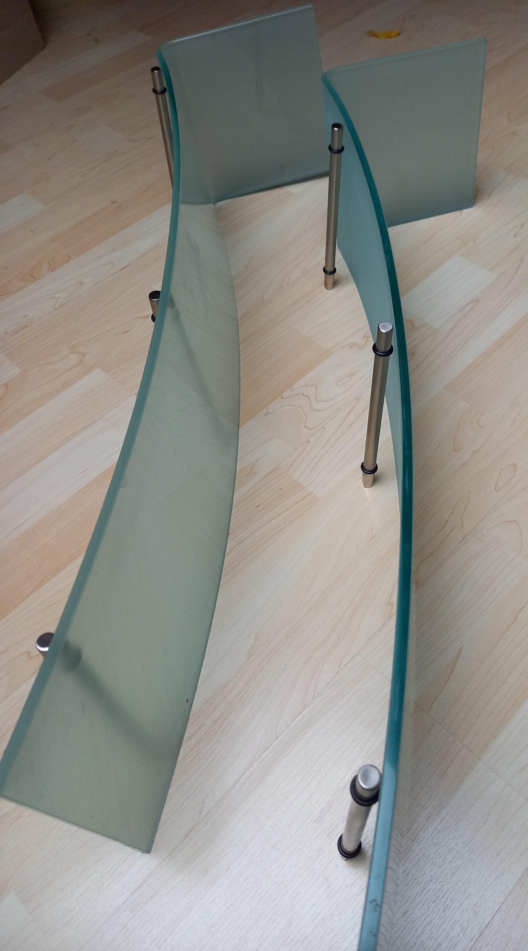 Beschreibung: 2 Bücherregale aus leicht hellblau mattiert Glas, jeweils mit 3 Halterungen an der Wand zu befestigen